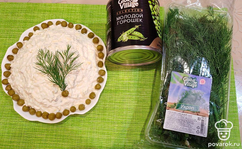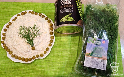 Украсьте зеленым горошком и укропом. Поставьте в прохладное место на 1 час.