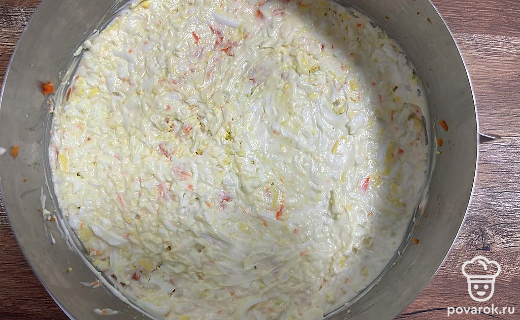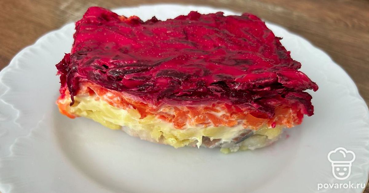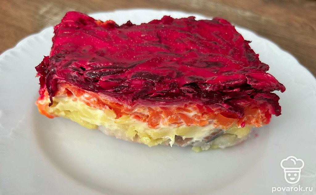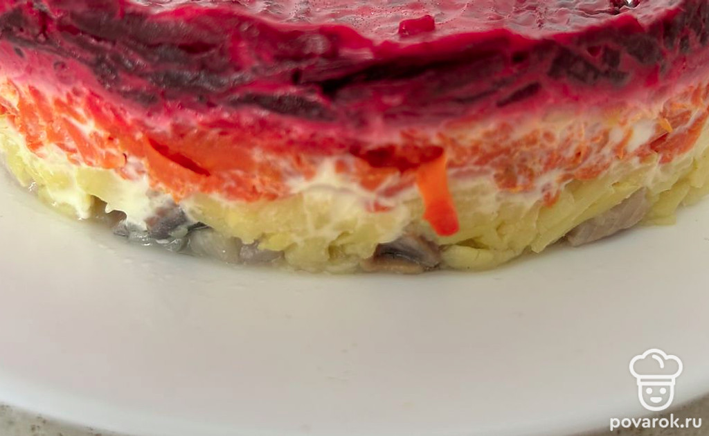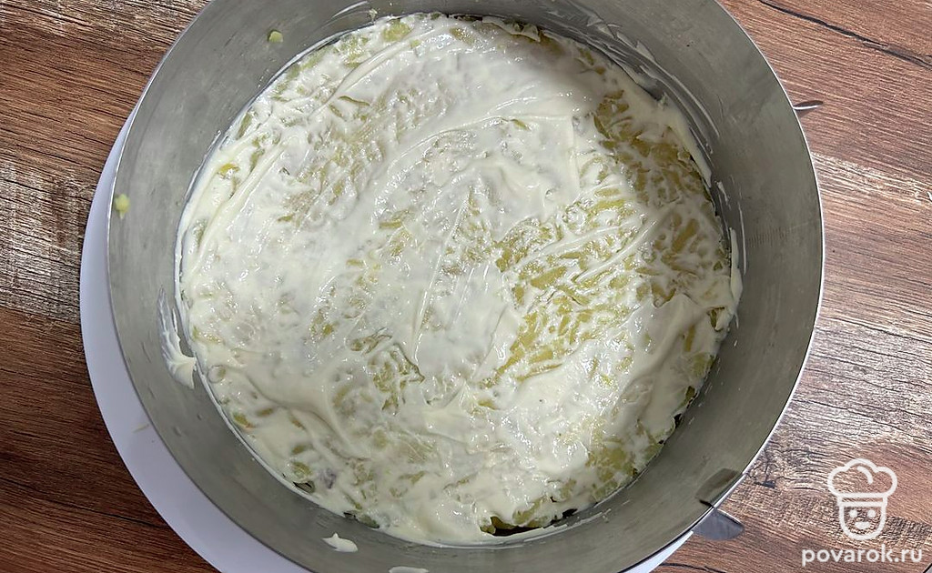 Перед подачей снимите кольцо. Рекомендую слегка смазать майонезом верхний слой. Приятного аппетита!