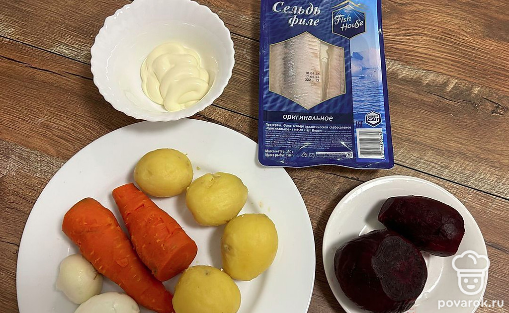 Подготовьте все ингредиенты. Лук заранее почистите, овощи отварите.