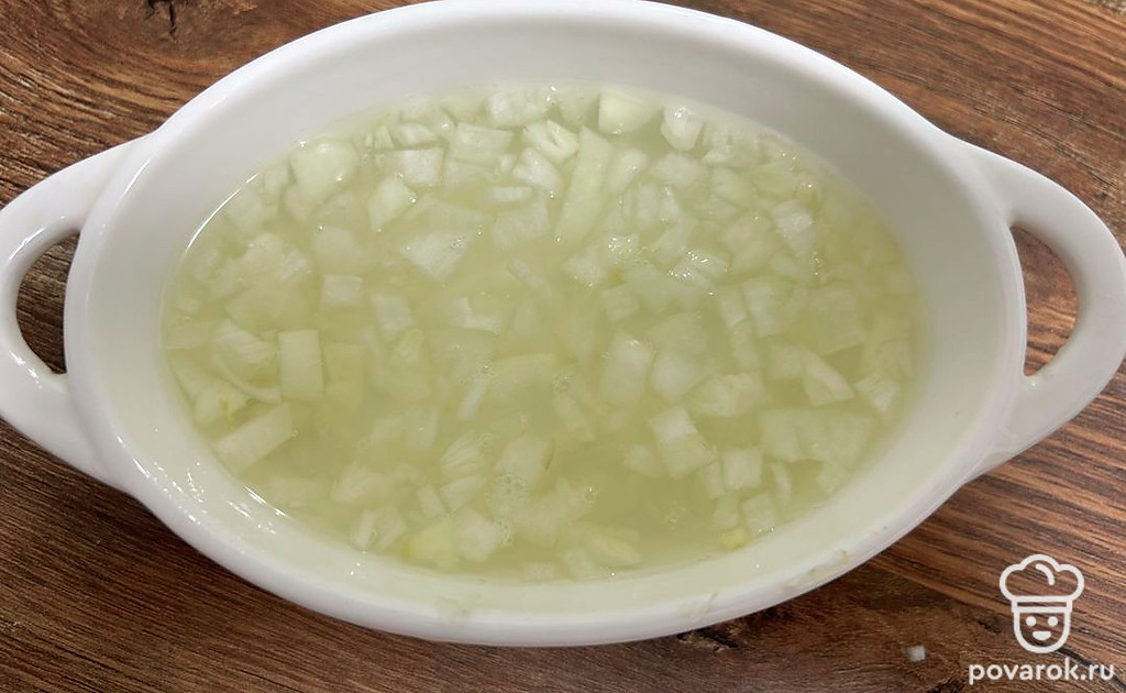 Лук мелко нарежьте, выложите в тарелку и залейте кипятком на 5 минут.