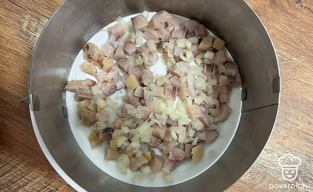 На плоскую тарелку поставьте кондитерское кольцо. Филе нарежьте средними кубиками и выложите на тарелку. С помощью сита слейте воду с лука, посыпьте луком сельдь.