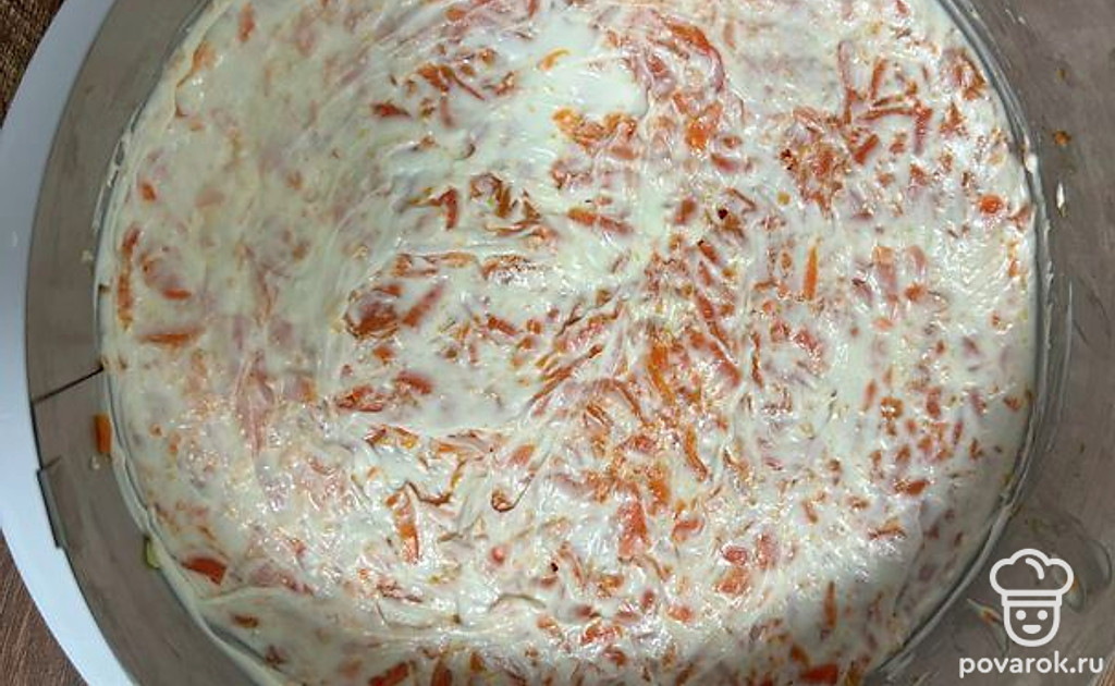 Морковь натрите на терке, распределите по тарелке, слегка утрамбуйте и смажьте майонезом.
