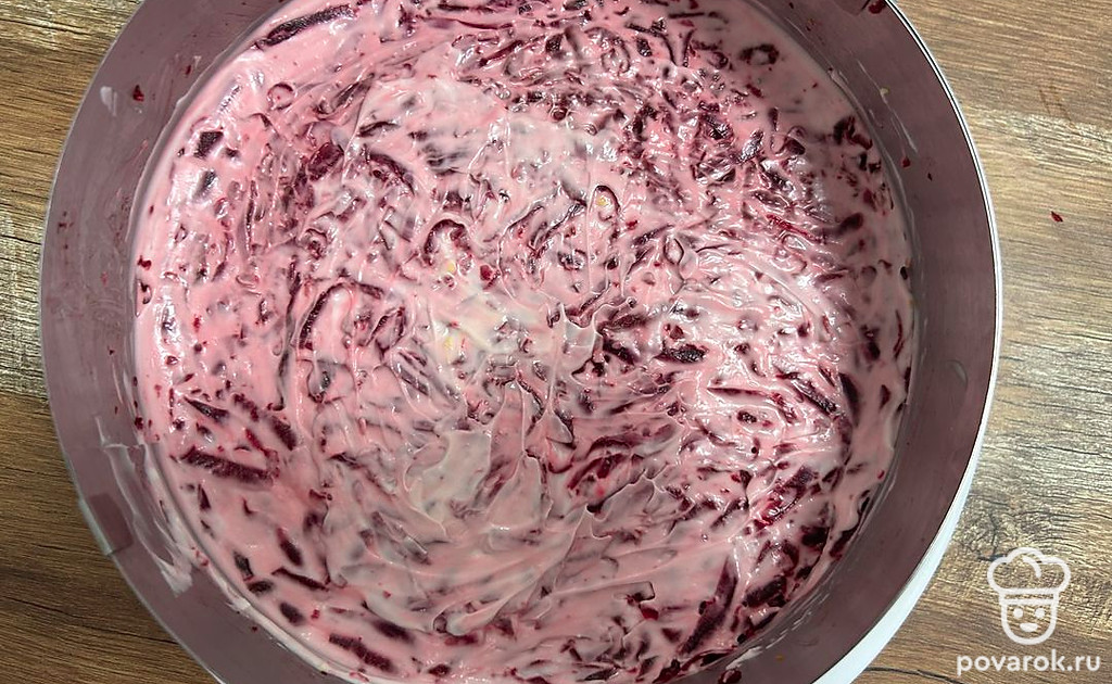 Свеклу натрите на терке, распределите по тарелке, слегка утрамбуйте и смажьте майонезом.
