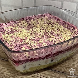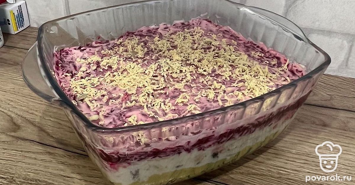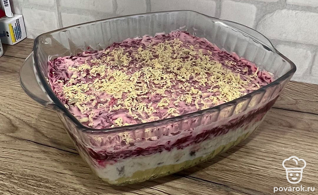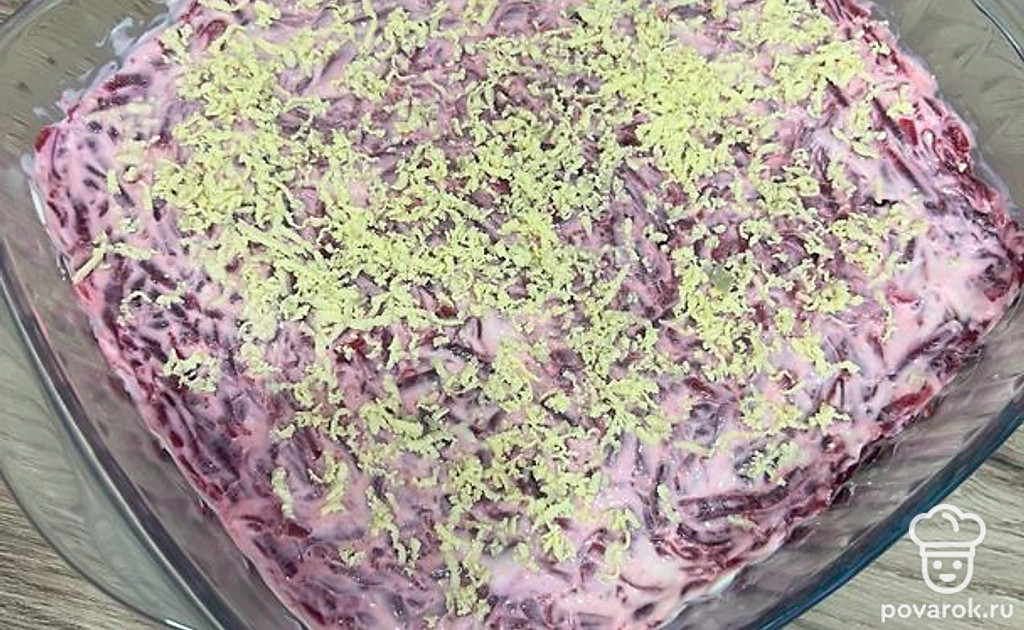 Заключительным слоем натрите свеклу, смажьте майонезом. Украсьте тертым яичным желтком.