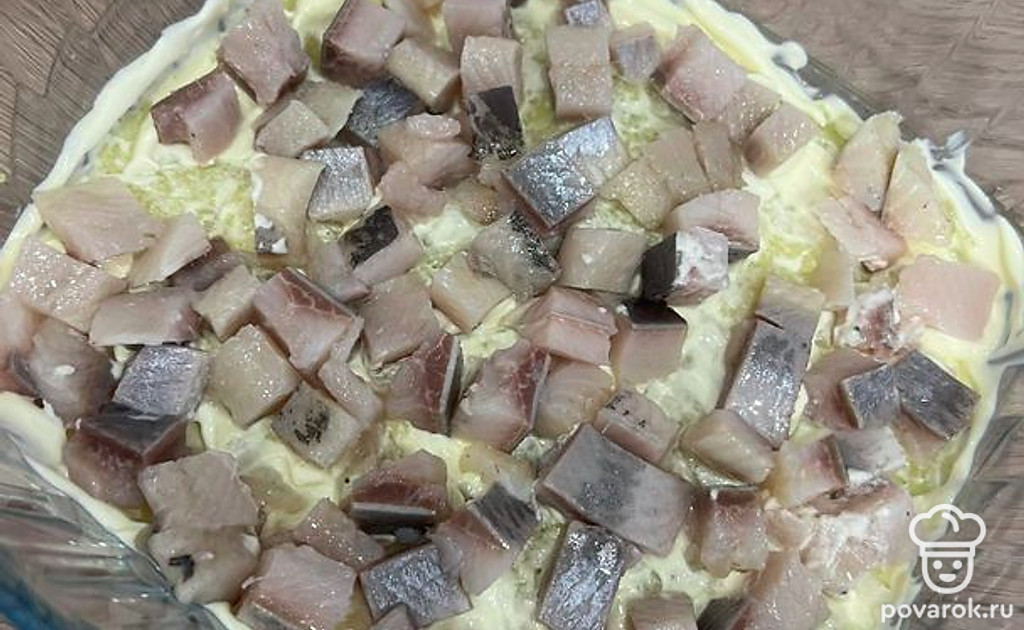 Сельдь нарежьте кубиками. Остальные продукты натрите на терке, первым слоем выложите тертый картофель.