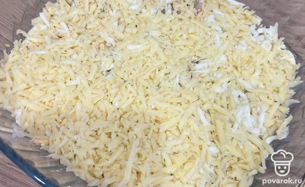 Сверху натрите яйцо. Далее посыпьте тертым сыром, смажьте майонезом.