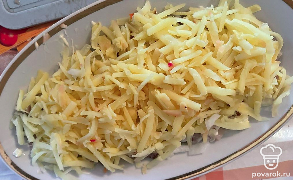 Морковь измельчить на крупной терке. Сверху распределить сеточку из майонеза.