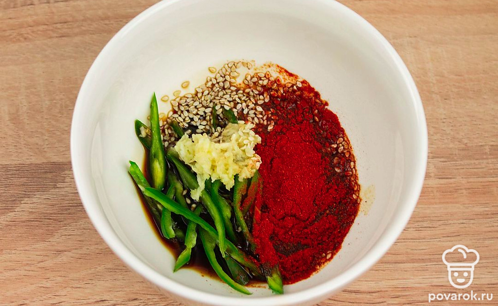 В подходящей по размеру емкости смешайте нарезанный перец, кунжут, чеснок, специи и соевый соус. Смешайте до однородности.
