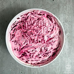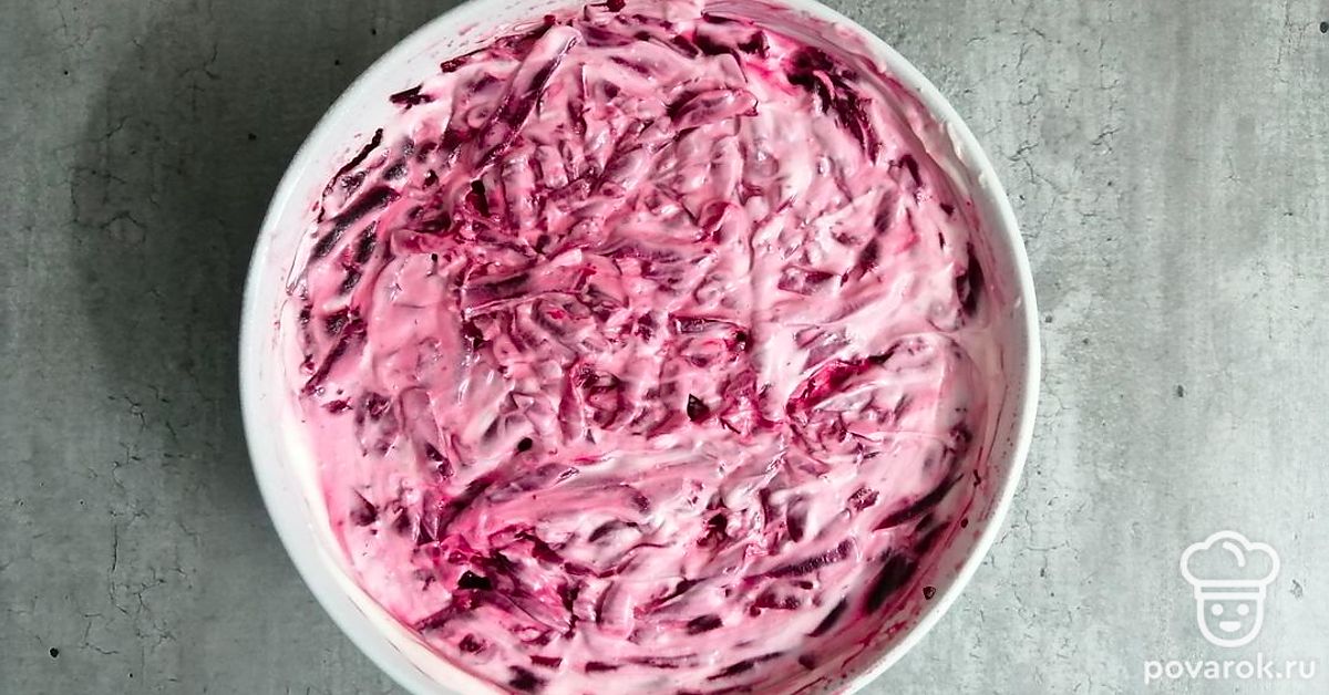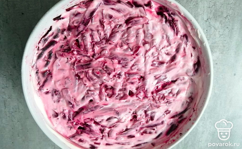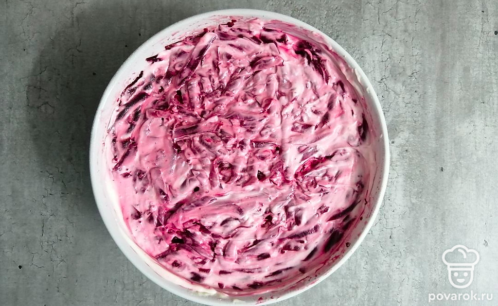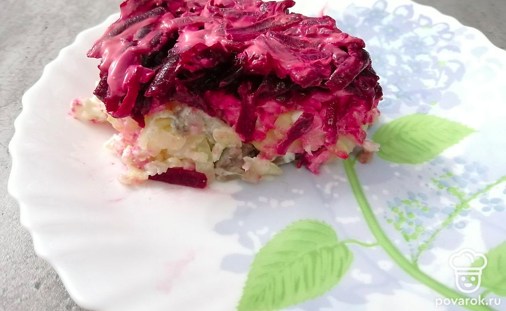 Заключительный слой — вареная свекла. Убрать салат в холодильник на 1,5 часа.