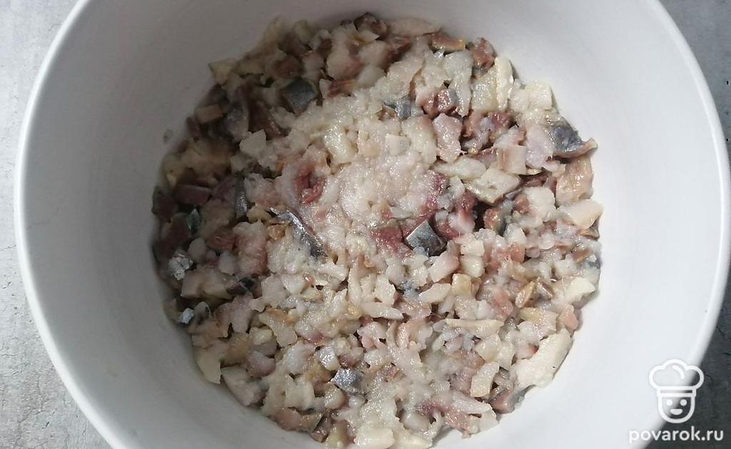 Первым слоем выложить селедку. Каждый слой смазать майонезом.