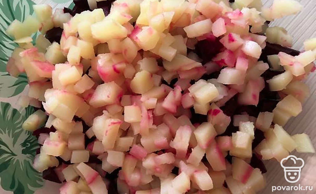 Вареную картошку режем кубиками.