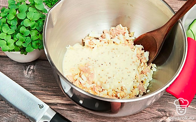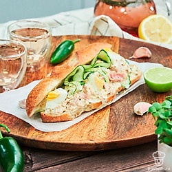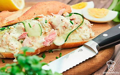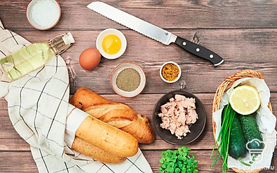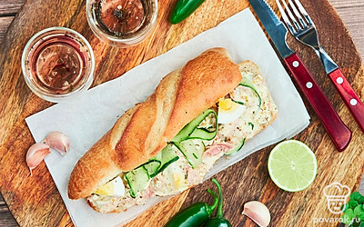 Из багета можно приготовить сытное и полезное блюдо с начинкой из консервированного тунца, яйца и домашнего майонеза. Делается заправка очень просто из доступных продуктов. Тунец подойдет в собственном соку или масле. Первый менее вреден для фигуры, второй — сытнее. Для того, чтобы закуску было удобно есть и готовить, возьмите мини-багеты весом по 100-150 г.