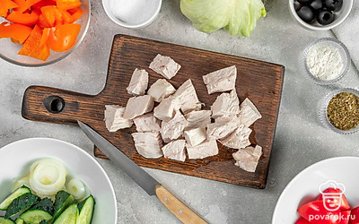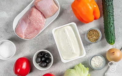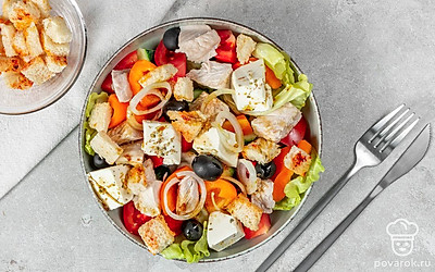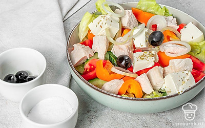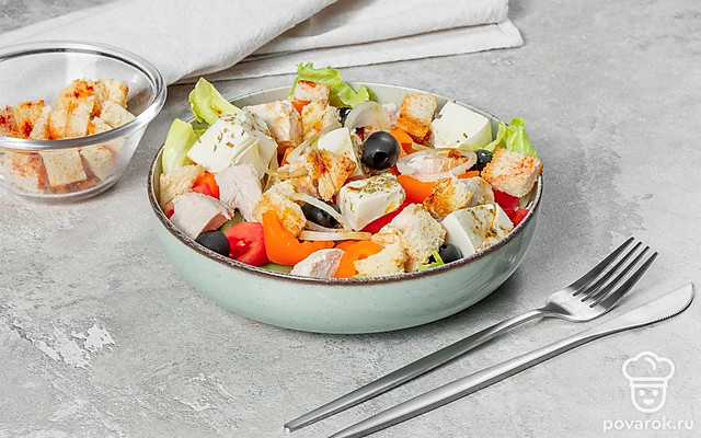 Такой вариант греческого салата с куриной грудкой сделает закуску сытной и необычной. Грудку лучше покупать на кости, с кожей и не снимать кожицу и мясо с кости при варке — так из мяса уйдет наименьшее количество сока. Все ингредиенты нарезаются крупными кусками, как и в классическом рецепте. В греческом салате часто используется орегано или душица. Это одна из самых ароматных пряностей, которую принято совмещать с чесноком, так как они идеально сочетаются и дополняют друг друга.