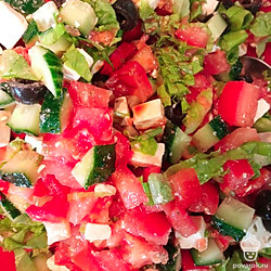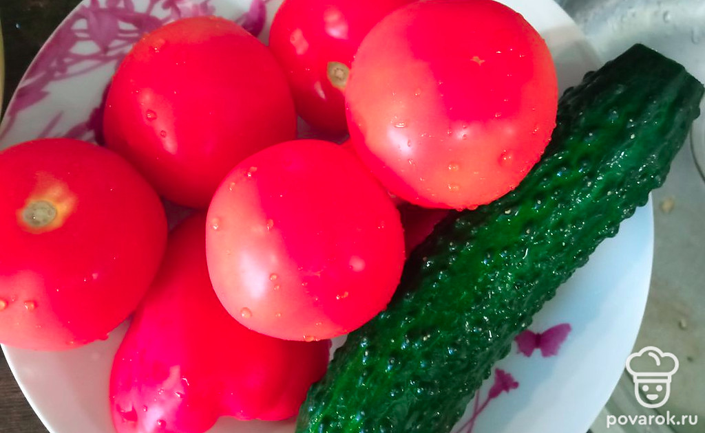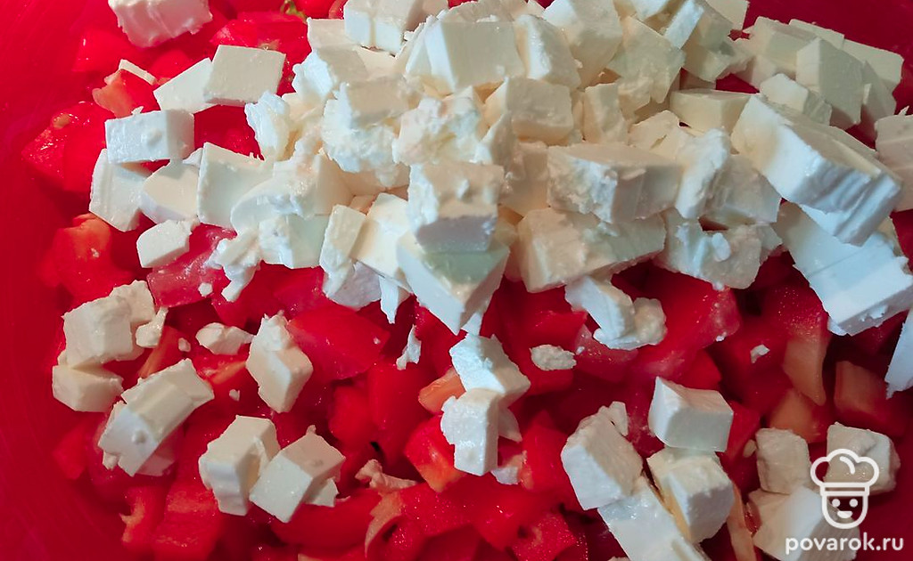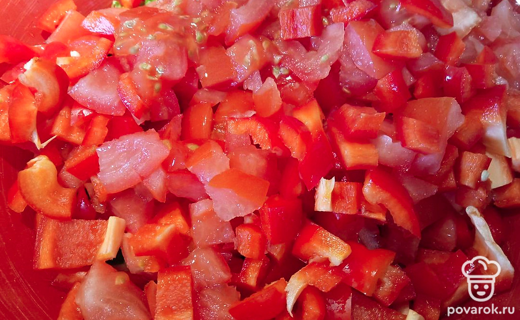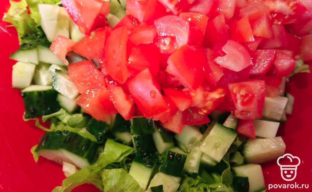 Нарежьте помидоры и высыпьте к остальным. Я их режу не последними, так как салат едим сразу после приготовления.