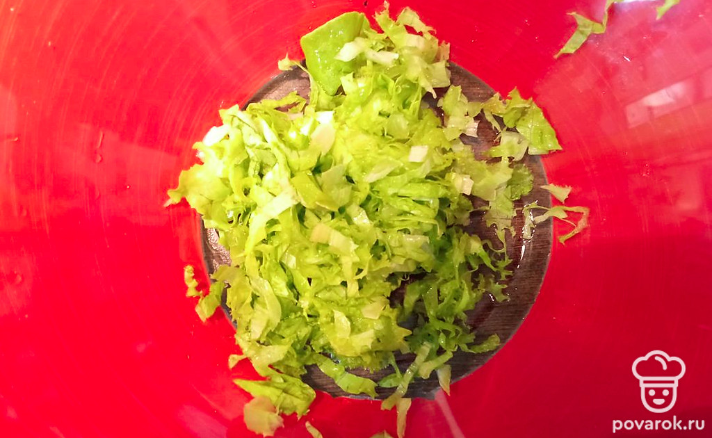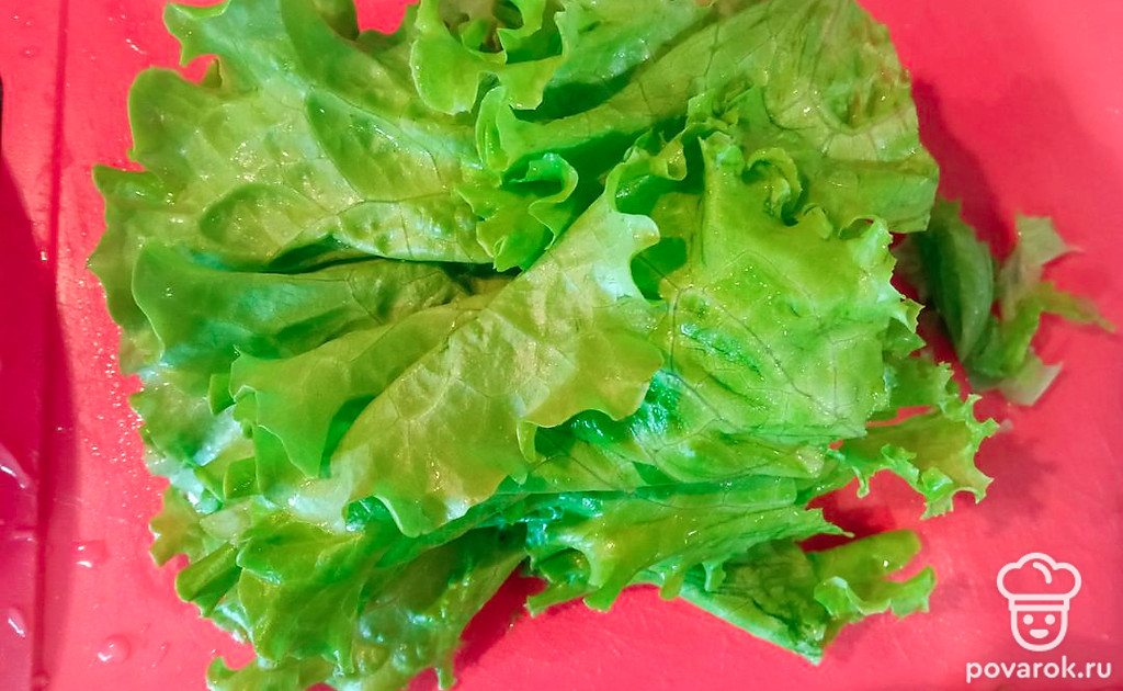 Помойте и чуть отожмите листья салата (можно положить на салфетку, чтобы стекла вода).