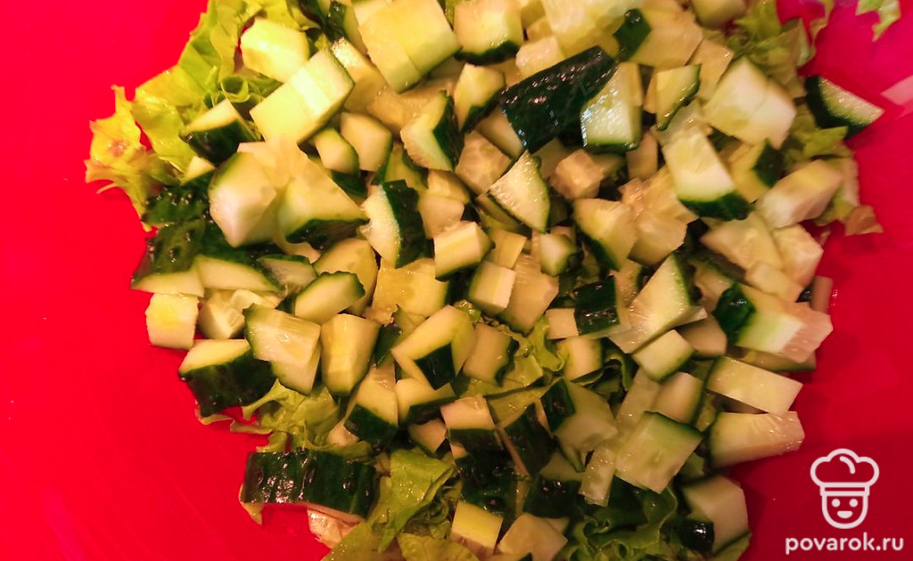 Огурец нарежьте кубиками и высыпьте в салатник.