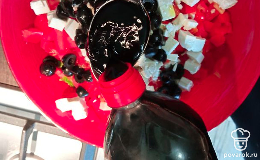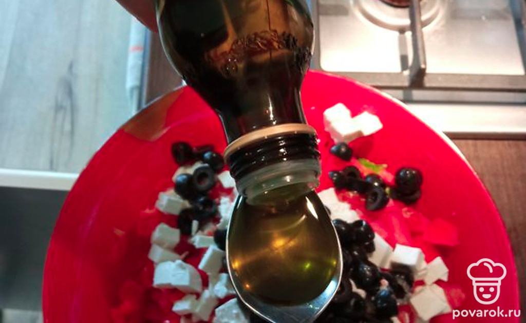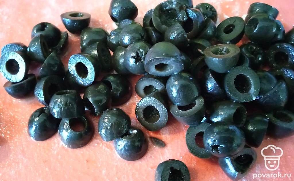 Воду из банки с оливками слейте, разрежьте каждую поперёк на две половинки.