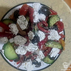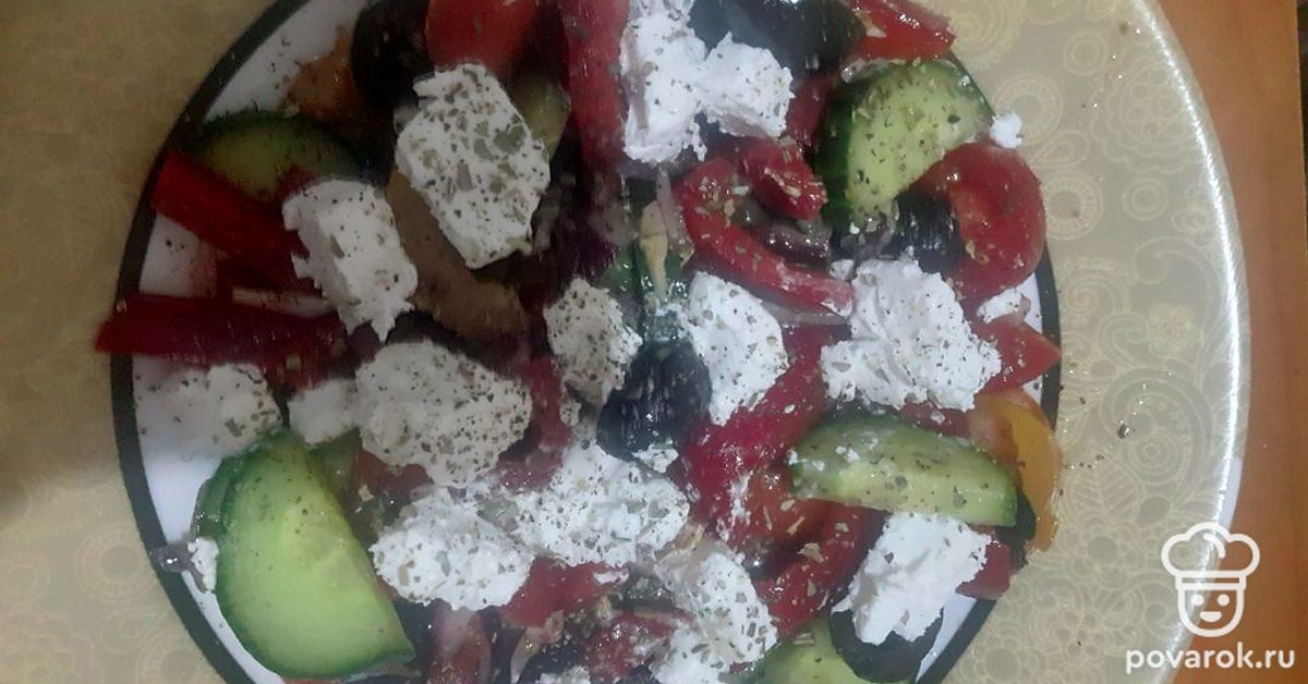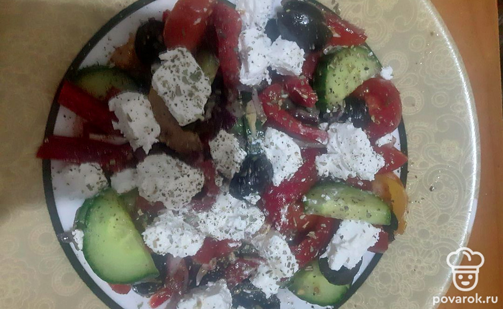Перед подачей на стол заправьте все еще раз черным молотым перцем и орегано по вкусу. Украсьте сыром и маслинами.