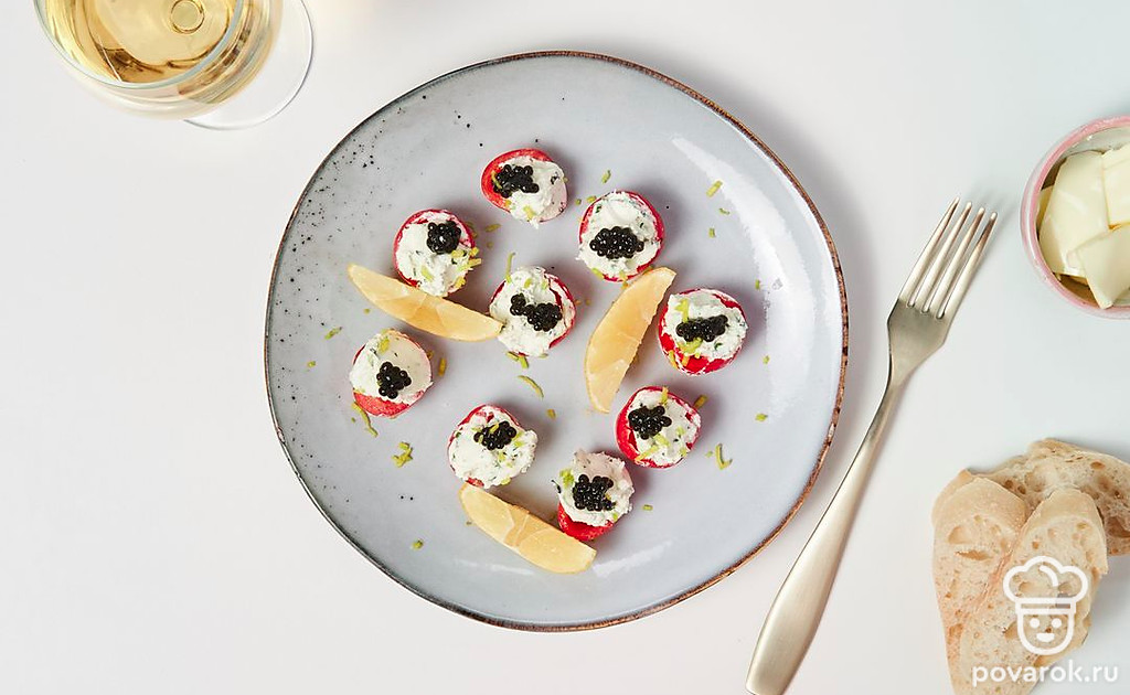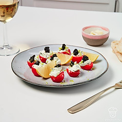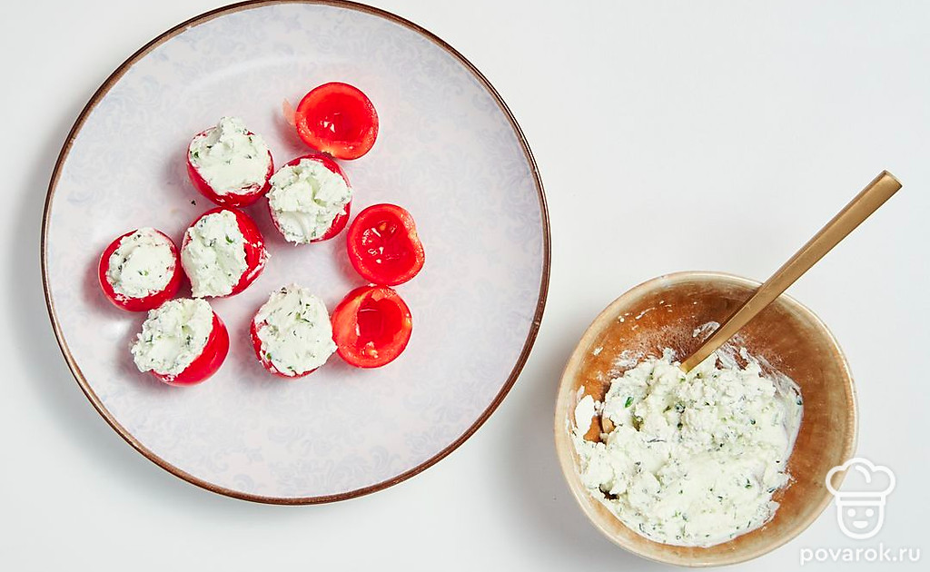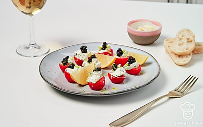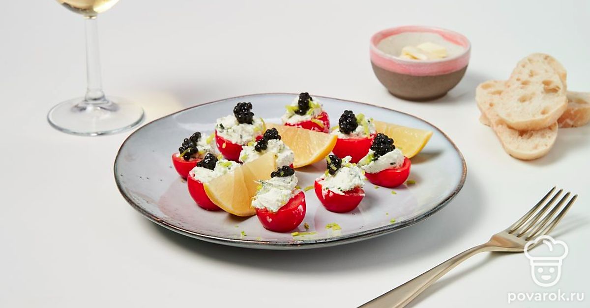 Фаршированные помидоры черри выглядят очень необычно и эффектно на любом столе. Аппетитная закуска из мини-томатов, сливочного сыра и базилика станет изюминкой вашего вечера. Помидоры черри отличаются своей миниатюрностью, поэтому им больше подходят кремовые начинки. Такая закуска не требует много сил и времени на приготовление, но зато может спасти положение, если основное блюдо еще не готово. Солоноватая красная икра добавляет пикантности и яркий акцент блюду.