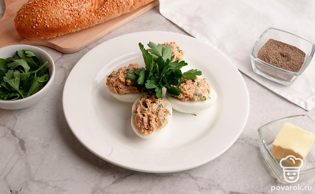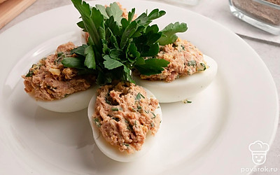 Полученную смесь выложите в готовые половинки яичного белка. Яйца фаршированные яйца печеночным паштетом выложите на тарелку и украсьте свежей петрушкой на свой вкус. Приятного аппетита!