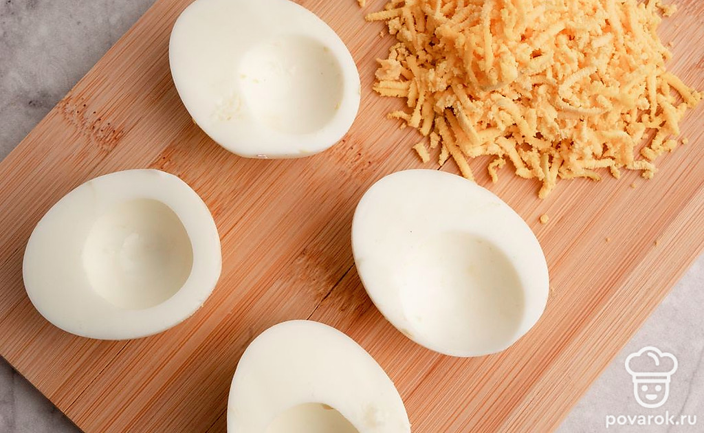 Вареные яйца очистите от скорлупы, разрежьте напополам и извлеките желтки. Натрите желтки на мелкой терке.