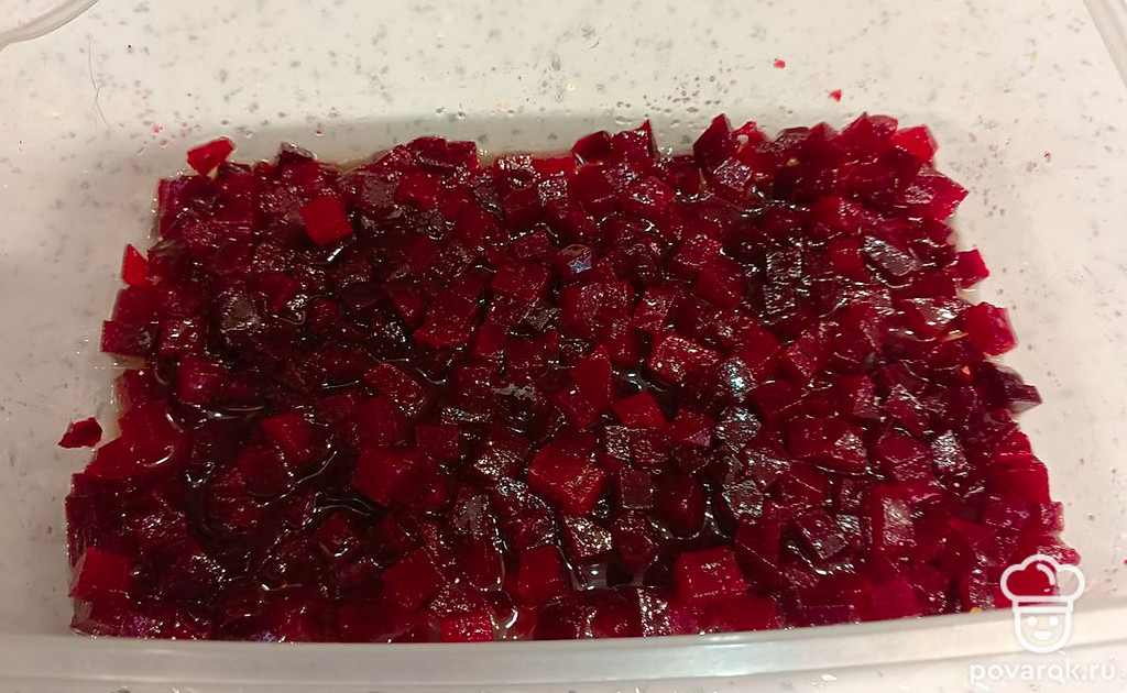 Вся фишка в том, что винегрет выкладывается слоями. Так блюдо может храниться до 3 дней, и овощи сохраняют свой цвет. Первый слой — отварная свекла, нарезанная мелким кубиком. Залейте ее нерафинированным маслом (с запахом). Добавьте щепотку лимонной кислоты и 2-3 чайных ложки сахара. Все хорошо перемешайте.