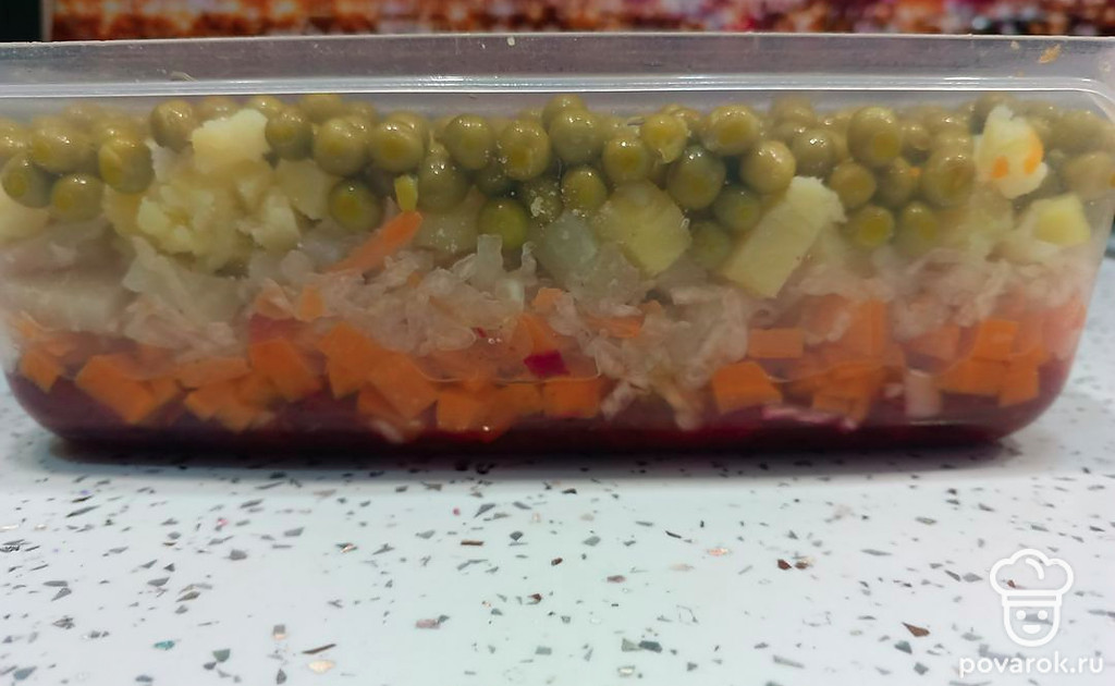 Выложите слоями остальные овощи (лук, морковь, картофель, квашеная капуста, маринованный огурец и зеленый горошек). По желанию можно добавить черный молотый перец.