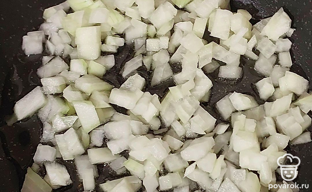 Лук нарежьте кубиком и обжарьте на растительном масле.