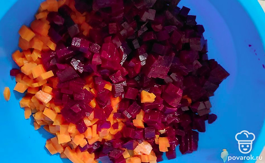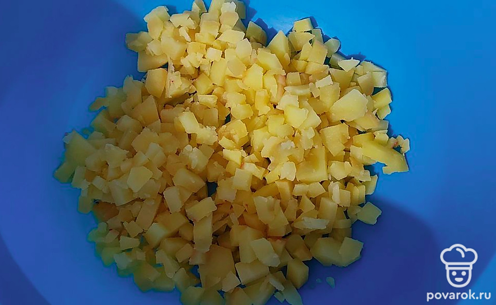 Заранее отваренные овощи тоже нашинкуйте кубиками. Начните с картошки.