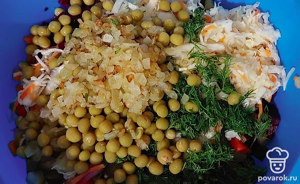 Добавьте мелко рубленный укроп и зеленый горошек. Сверху залейте остывшее масло с луком. Посолите все и тщательно перемешайте.