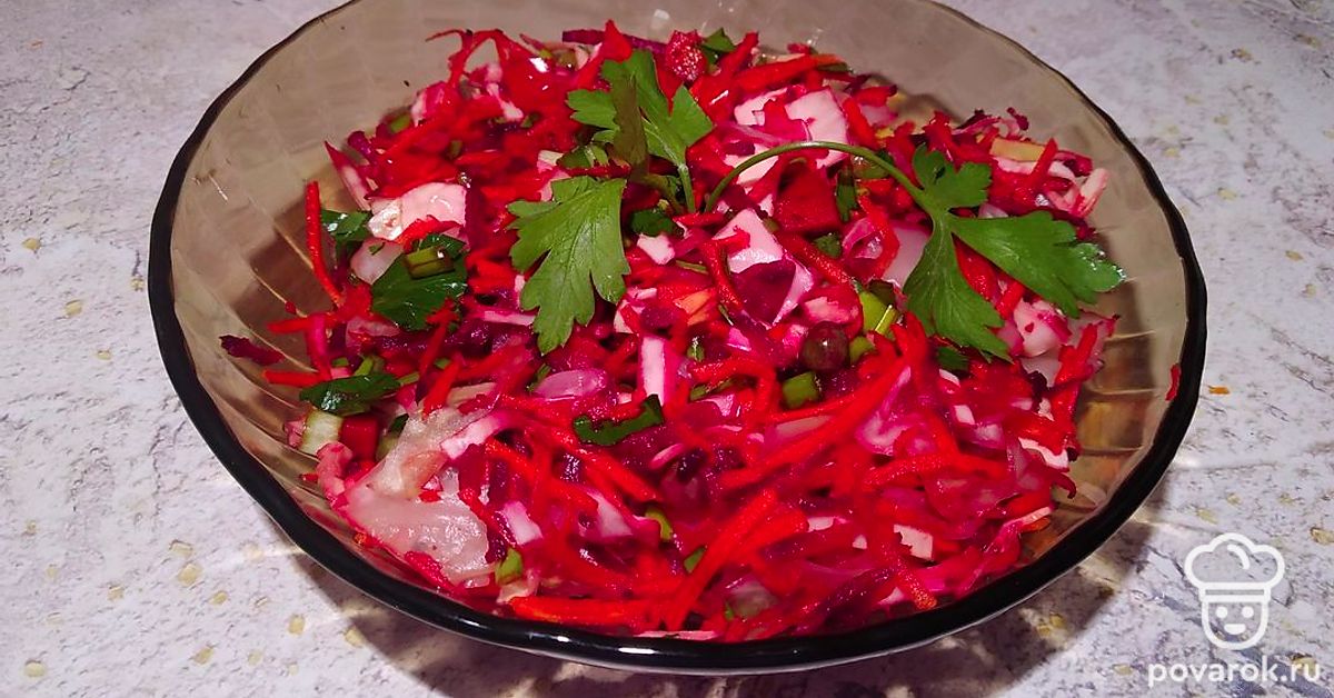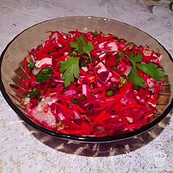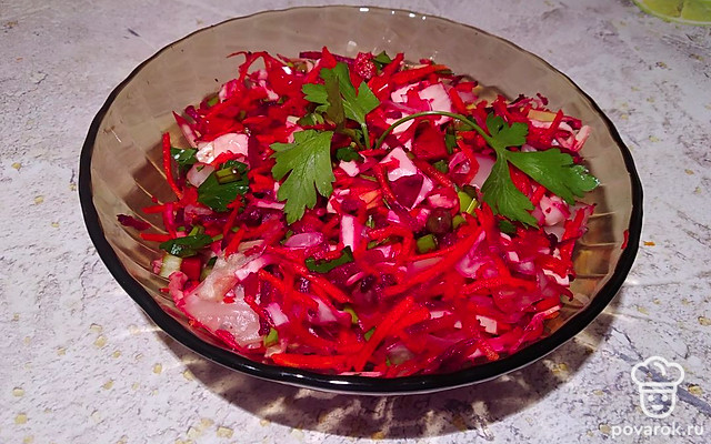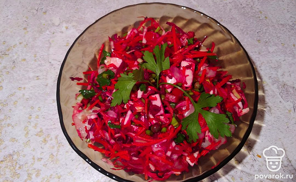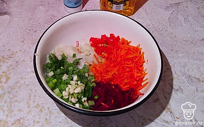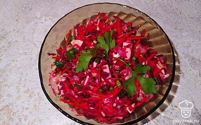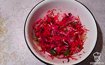 Все выкладываем в одну миску, добавляем щепотку морской соли и каплю подсолнечного масла холодного отжима.