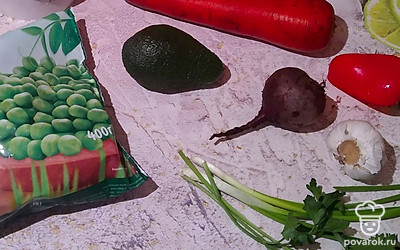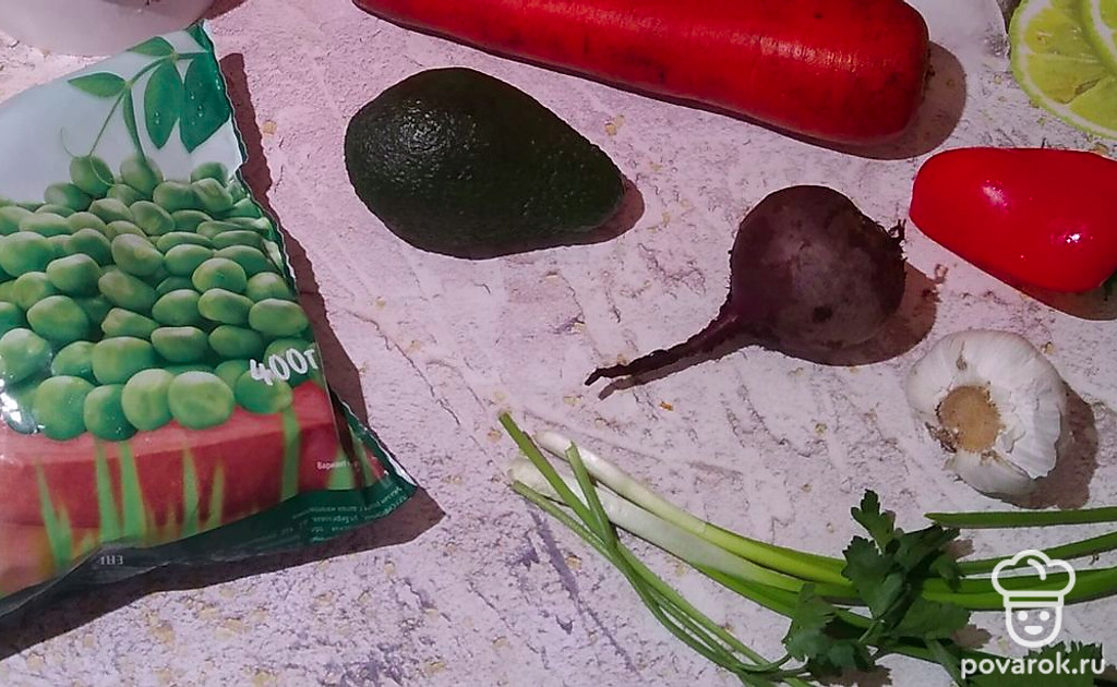 Моем морковь, свеклу, авокадо, красный болгарский перец, зеленый лук и петрушку. Авокадо, морковь, свеклу и два зубчика чеснока очищаем.