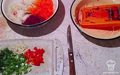 Выкладываем в миску квашеную капусту. Свеклу и морковь натираем на терке для корейской моркови. Мелко нарезаем авокадо, красный перец, чеснок, зеленый лук и петрушку. Размораживаем зеленый горошек.