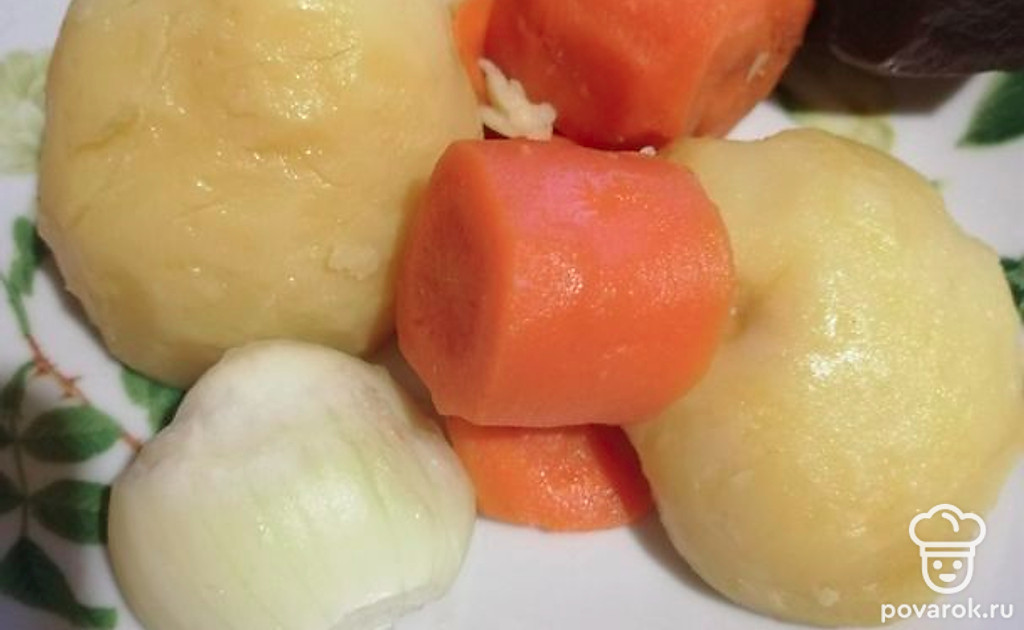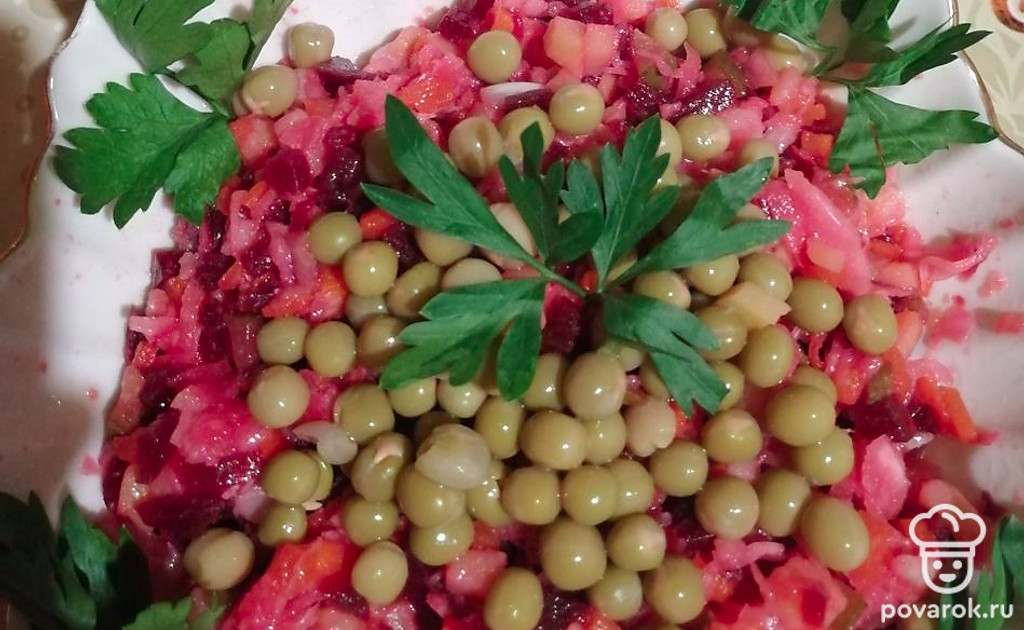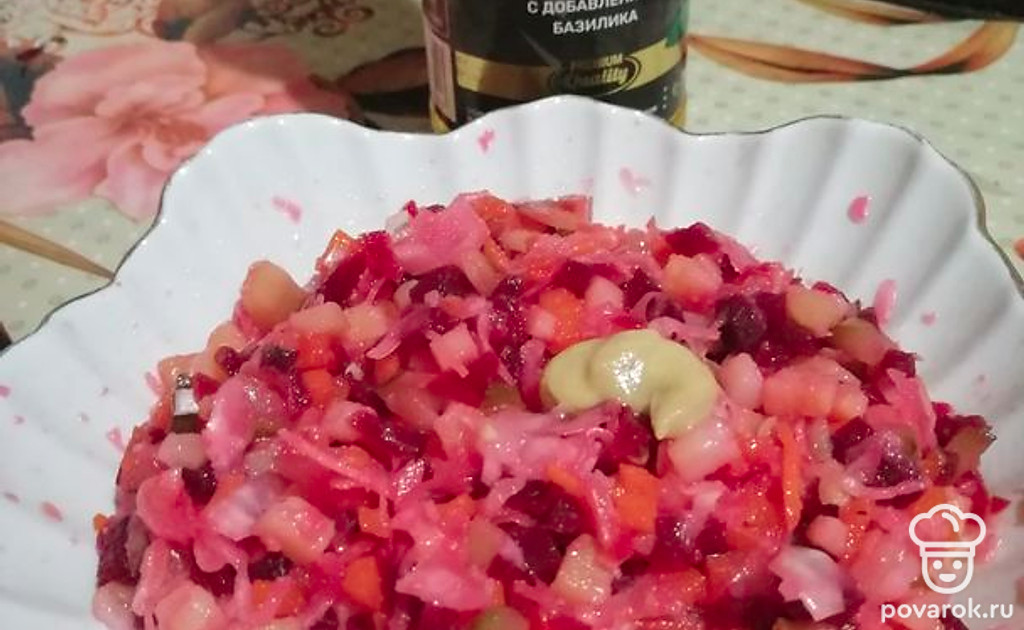 Нарезать картофель, морковь, свёклу небольшими кубиками. Одну небольшую луковицу мелко нарезать. Посолить, добавить щепотку зиры и немного горчицы. Заправить винегрет растительным маслом и все тщательно перемешать. И дать винегрету немного настояться,чтобы он был ароматным.