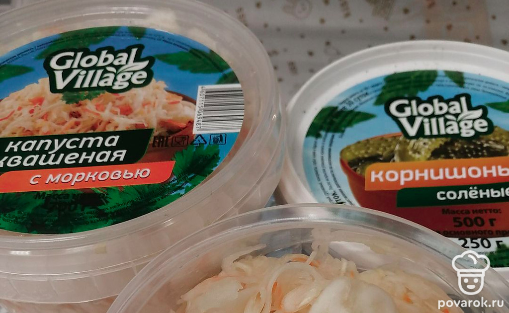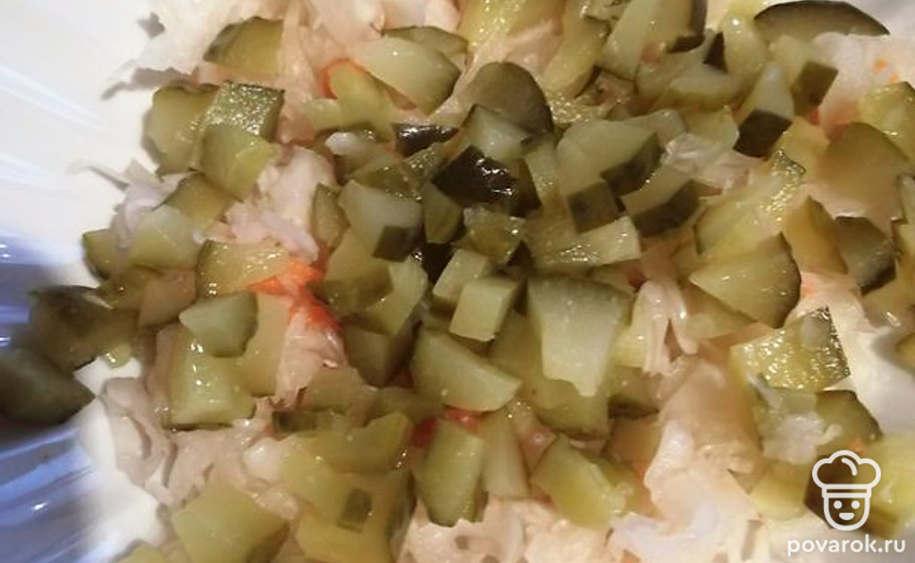 Положить в салатник капусту и мелко нарезанные соленые огурцы.