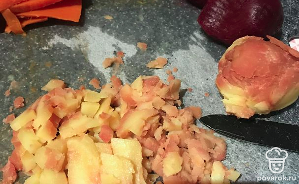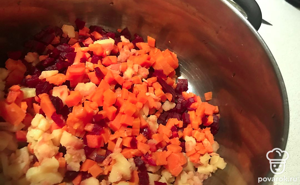 Порежьте все овощи размером примерно с горошину, довольно мелко.