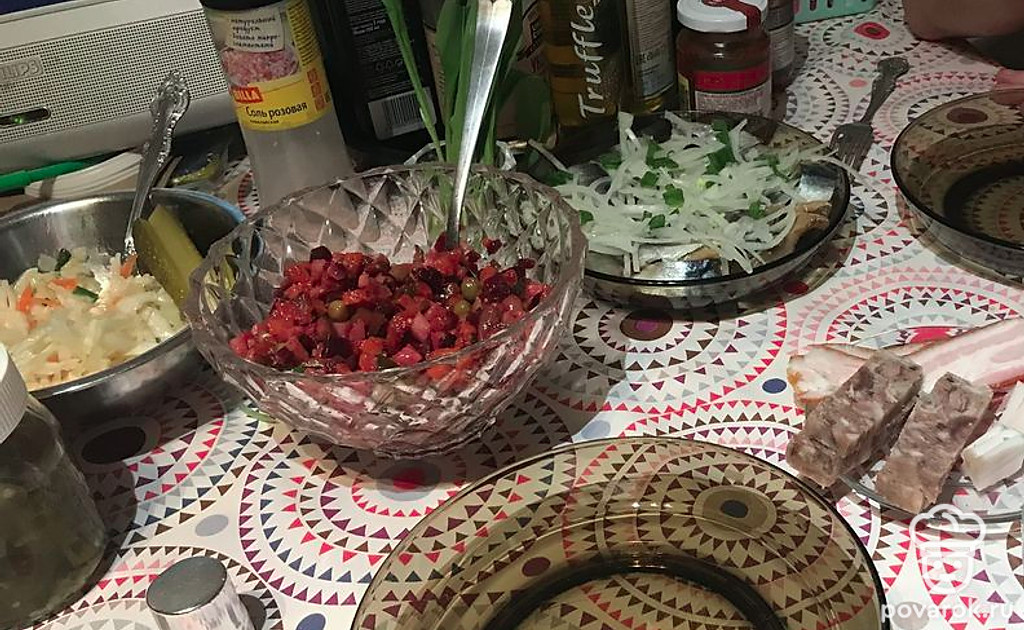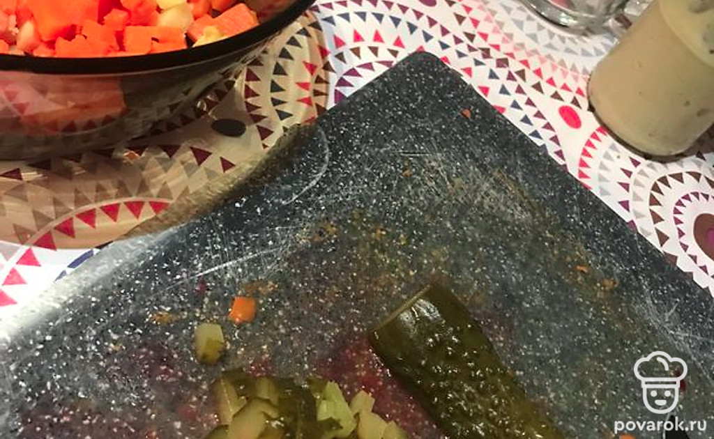 В последнюю очередь положите маринованные или соленые огурчики, тоже порезанные до размера горошка.