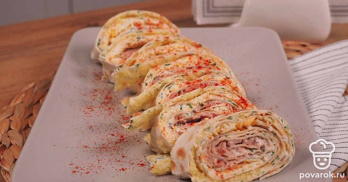 Заверните салат в лаваш. Разложите все три лаваша рядом друг с другом. Смажьте их майонезом. На первый лаваш выложите консервированный тунец. Распределите по всей площади. На второй лаваш выложите тертый сыр. На третий – тертые вареные яйца. Первый лаваш закрутите в рулет, положите на край второго лаваша и скрутите, как бы укутывая первый рулет во второй лаваш. Так же поступите с третьим лавашем: на его край положите готовый двойной рулет и скрутите. Нарежьте салат на порции.
