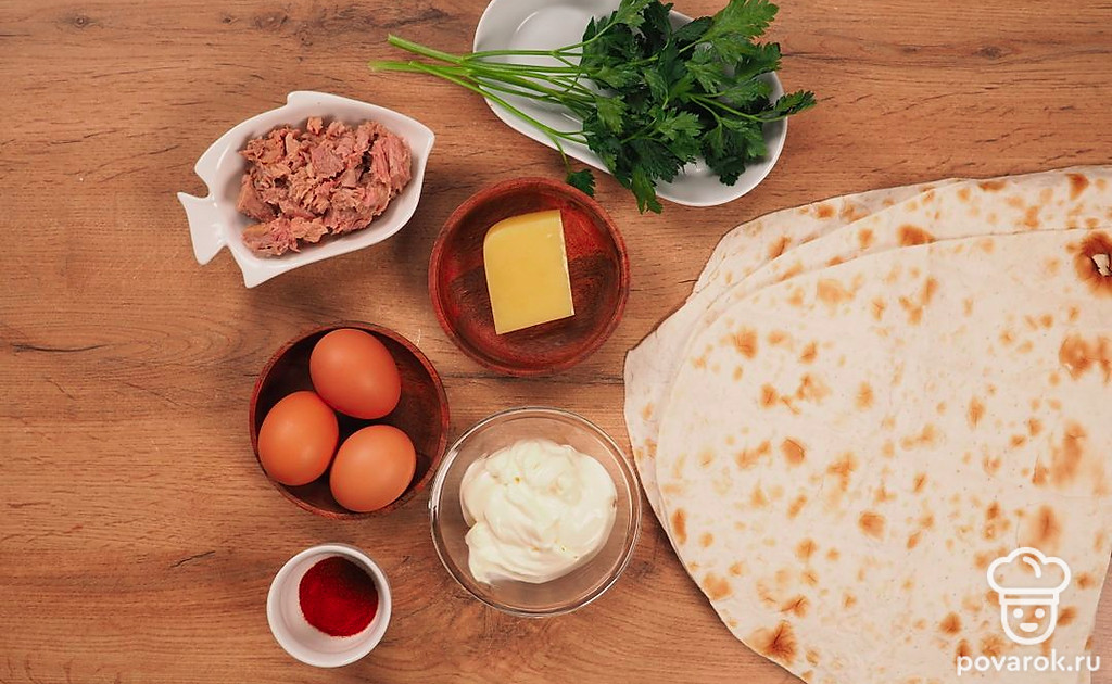 Отварите яйца вкрутую. Вымойте и мелко нарежьте зелень. Натрите сыр. Почистите яйца и натрите на терке. Консервированный тунец достаньте из банки, разомните на плоской тарелке. Лаваш разрежьте на три прямоугольника одного размера.