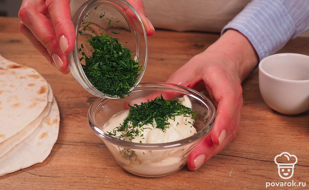 Приготовьте салат. Добавьте рубленую зелень в майонез, перемешайте.