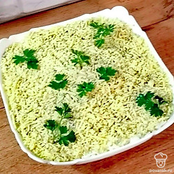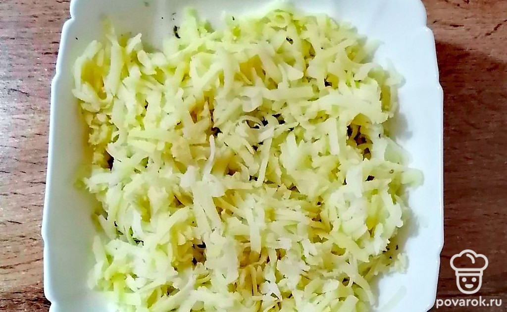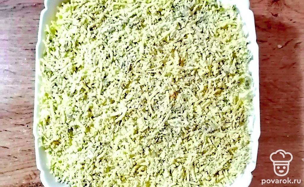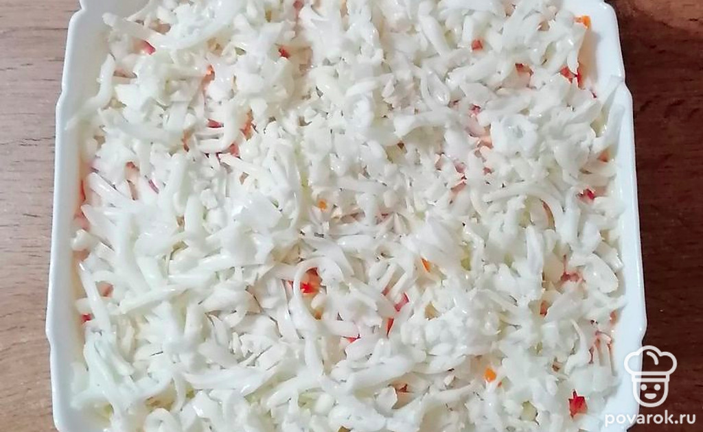 Белки яичные натрите на крупной терке, уложите следующим слоем. Приправьте майонезом.