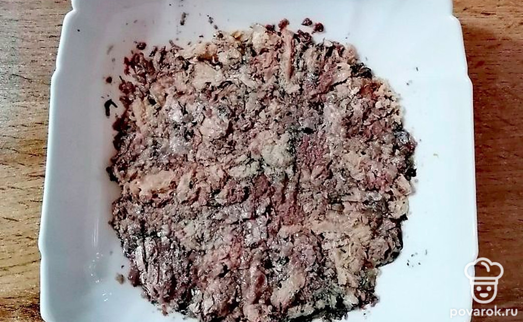 С рыбных консервов слейте жидкость. В салатницу переложите рыбу и разомните ее вилкой.