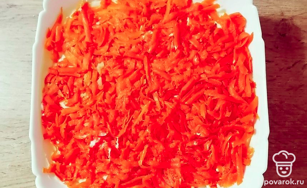 Морковь натрите на крупной терке и уложите следующим слоем. Смажьте майонезом.