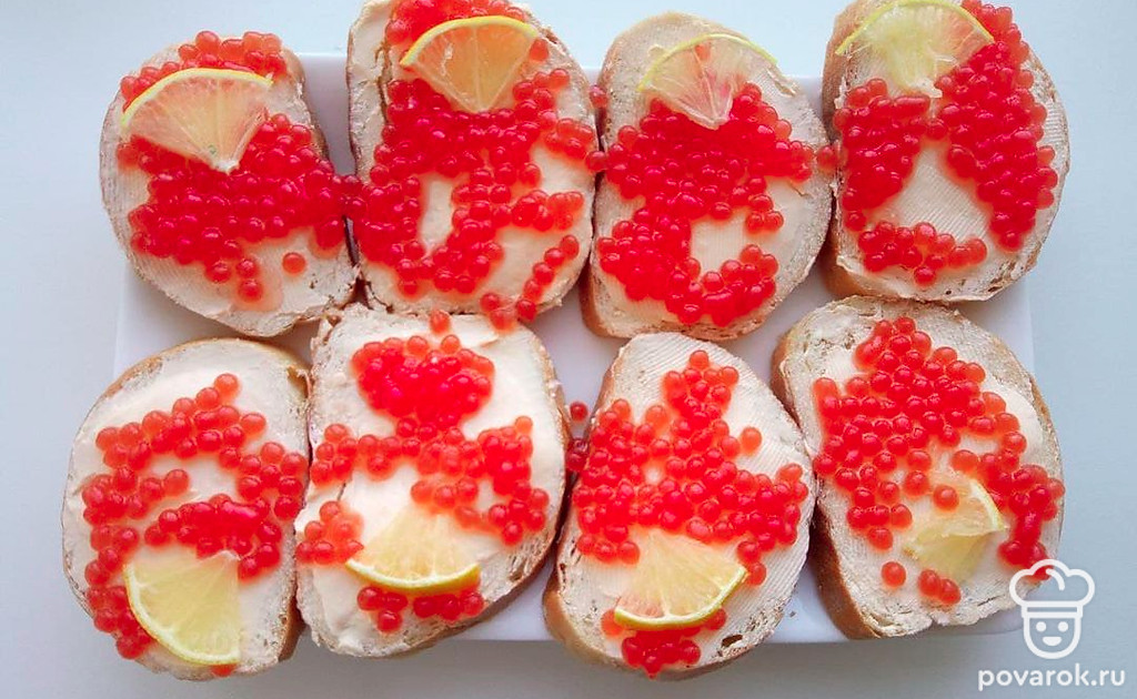 Намажьте ломтики хлеба сливочным маслом, затем на намазанный ломтик хлеба выложите красную икру. Нарежьте лимон на дольки и поставьте сверху красную икру.