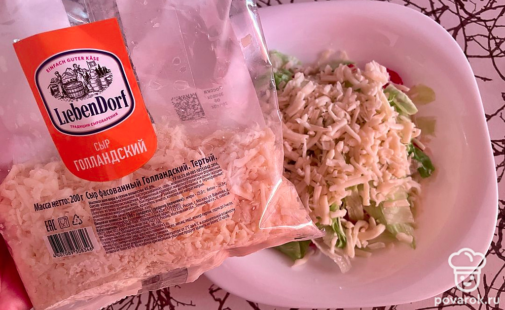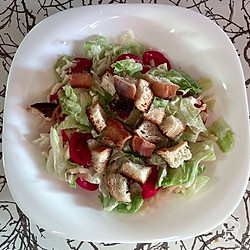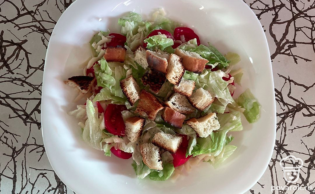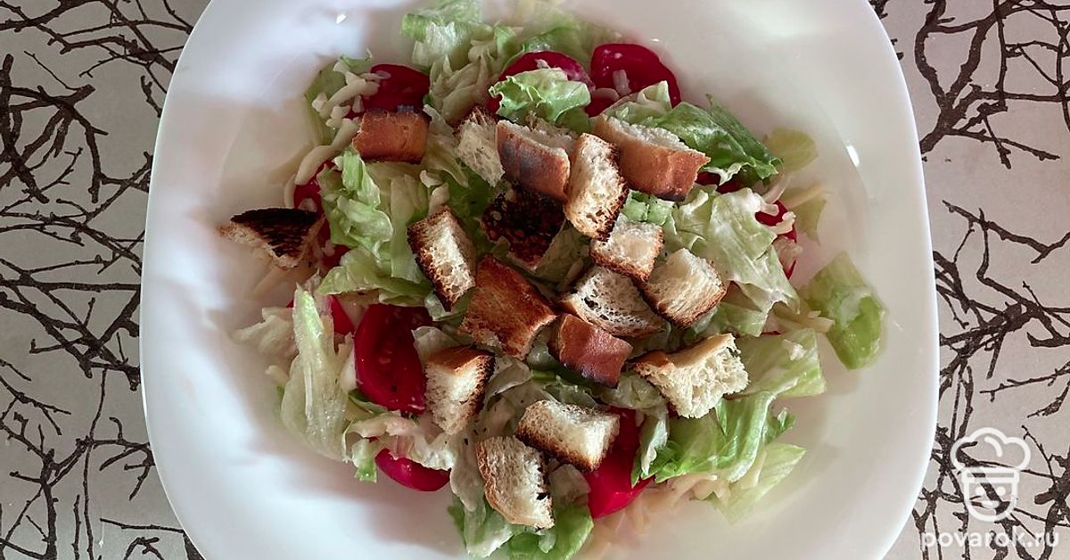Порубите салат айсберг, добавьте к остальным ингредиентам. Добавьте соус и сухари. Приятного аппетита!