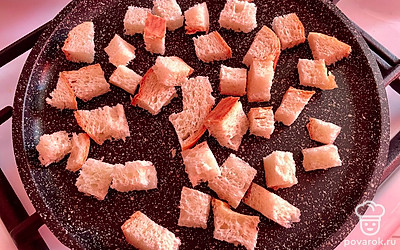 Хлеб нарежьте кубиком, обжарьте на сухой сковороде до образования легкой корочки.