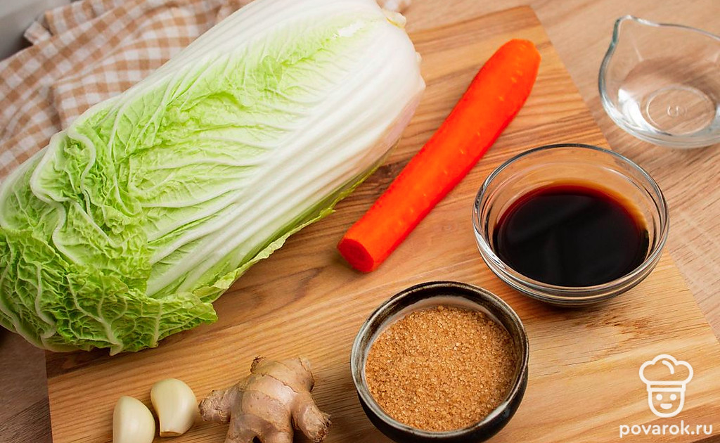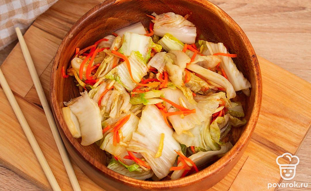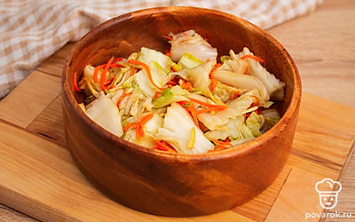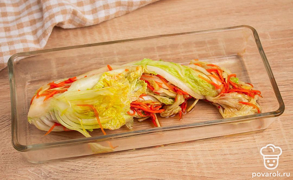 Пекинскую капусту очистите от верхних листьев. Разрежьте на 4 продольные части. Промойте листья капусты, аккуратно раздвиньте, а затем пересыпьте солью каждый лист, особенно у основания. Сложите капусту в глубокую миску и оставьте на четыре часа, периодически поворачивая, чтобы равномерно просолилось. Смешайте с готовой заправкой. Каждый лист пекинской капусты намажьте подготовленной заправкой, уложите капусту в подходящую емкость и оставьте на сутки в тепле, чтобы промариновалась.