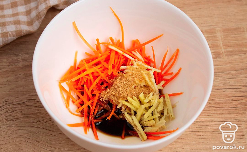 В подходящей по размеру емкости смешайте нарезанную морковь, натертый имбирь и чеснок, тростниковый сахар, соевый соус.