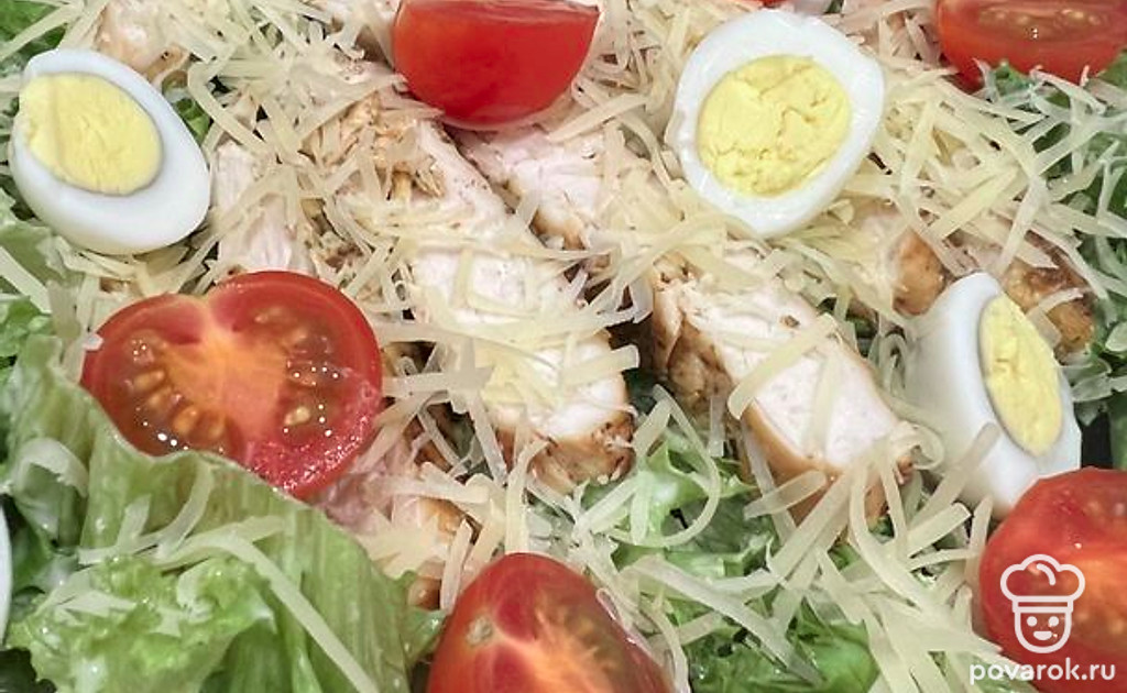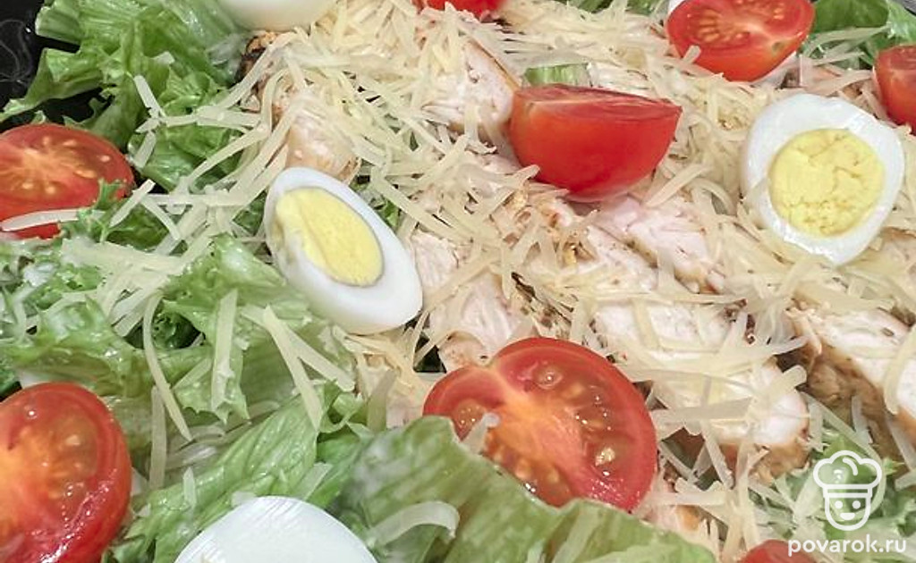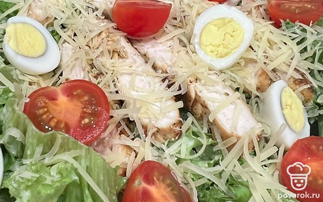 Соберите блюдо слоями. Листья салата, сверху сыр. Полейте соусом. Далее сыр. Мясо нарежьте на полоски и тоже отправьте в тарелку. Сверху помидоры. Можно есть.