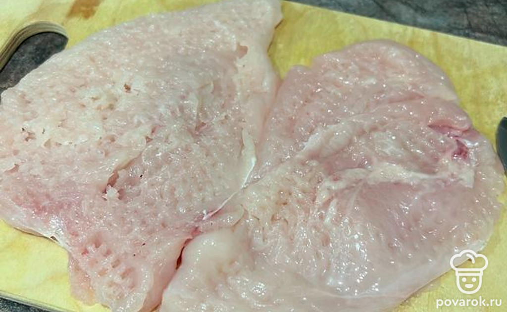 Филе промойте, высушите бумажными полотенцами. Разрежьте и отбейте в тонкий пласт. Посолите, поперчите и на раскаленной сковородке обжарьте до румяной корочки.